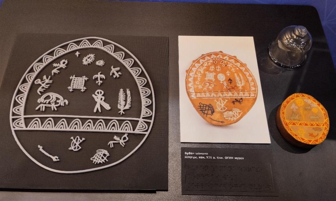 Выставка этого года крайне интересная. Лично мне безумно понравился стенд от Кемеровского государственного института культуры. Казалось бы, что делает культура на Технопроме. А вот что. У них есть своя лаборатория по адаптации регионального художественного наследия для лиц с нарушением зрительного анализатора. Они создают тактильные станции – это объёмные копии картин для незрячих и слабовидящих. Здесь представлены два стенда – «Телеутская невеста» и «Бубен шамана». Сделана уменьшенная копия бубна с колотушкой, которую можно потрогать.