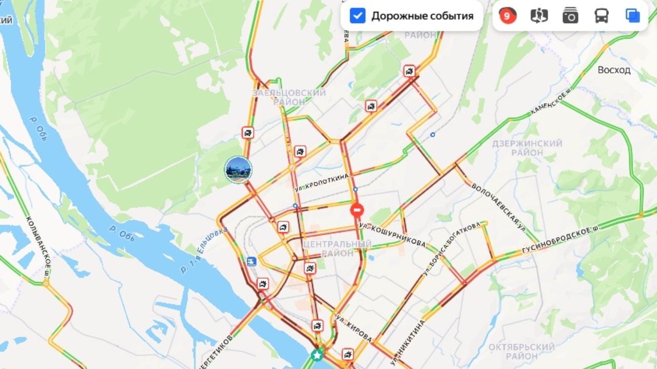 Яндекс оценивает пробки в Новосибирске вечером 19 декабря в 9 баллов.