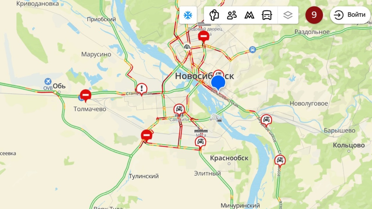 2ГИС оценивает пробки в Новосибирске вечером 20 января в 9 баллов.
