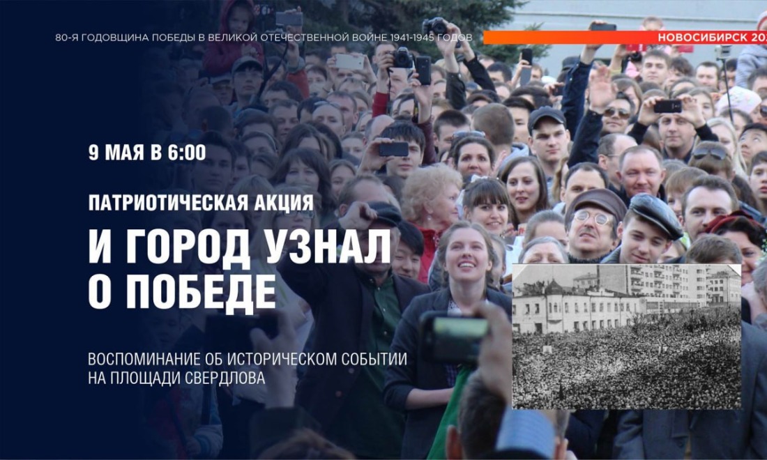 На площади собираются воссоздать атмосферу победного мая 1945-го года в момент официального объявления окончания войны. Голос Левитана, как и 80 лет назад, сообщит новосибирцам о Победе над фашистскими оккупантами. Потом прозвучат песни военных лет, воспоминания очевидцев и рассказы о трудовом подвиге сибиряков.