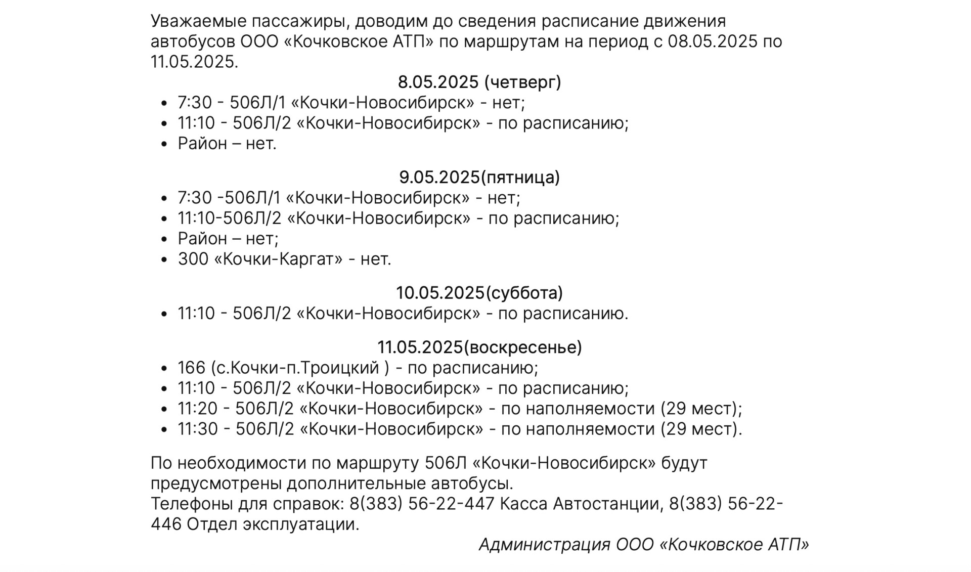 11 мая рейсы 166 «с. Кочки - п. Троицкий» и 506Л/2 «Кочки-Новосибирск» в 11:10 выполняются по расписанию. Дополнительные рейсы 506Л/2 в 11:20 и 11:30 будут отправляться при наличии пассажиров. При необходимости на маршруте 506Л «Кочки-Новосибирск» предусмотрены дополнительные автобусы, сообщили в администрации ООО «Кочковское АТП».