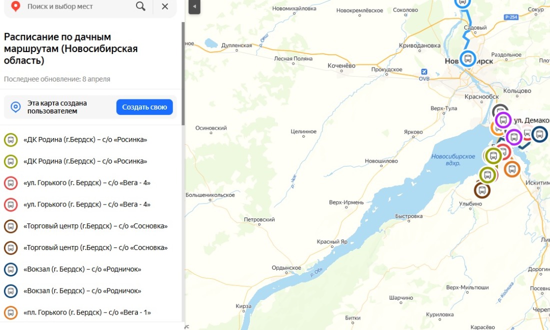 Онлайн-карта дачных маршрутов опубликована на сайте сервиса 2ГИС. У каждого маршрута определенный цвет, номер и расстояние — от 6 до 28 километров. Самый длинный маршрут — № 722 — от Бердска до «Родничка».