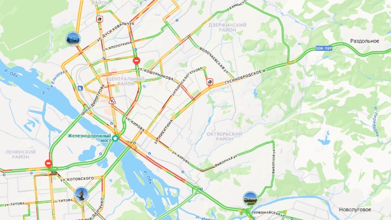 По данным дорожного сервиса Яндекса, проезд затруднён на улицах Кошурникова, Кирова, Дуси Ковальчку, Бориса Богаткова, Троллейной, Немировича-Данченко, на Бердском шоссе и других автомагистралях города.