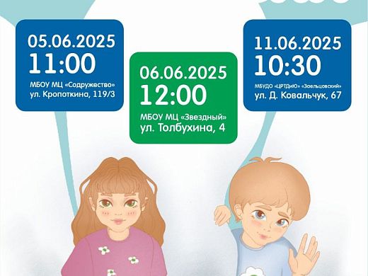 Ещё два — 11 июня в 10:30 в Центре развития творчества детей и юношества «Заельцовский» на улице Дуси Ковальчук, 67 и 6 июня в 12:00 в МБОУ МЦ «Звёздный» улица Толбухина, 4.