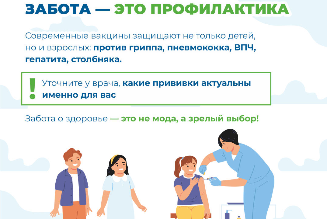 Защитите себя и своих близких! Сделайте прививку — это безопасно, надёжно и спасает жизни. Вакцинация доступна во всех поликлиниках по месту жительства. Не откладывайте здоровье на потом!Вакцины — самые безопасные фармацевтические препараты. Серьёзные осложнения — большая редкость.