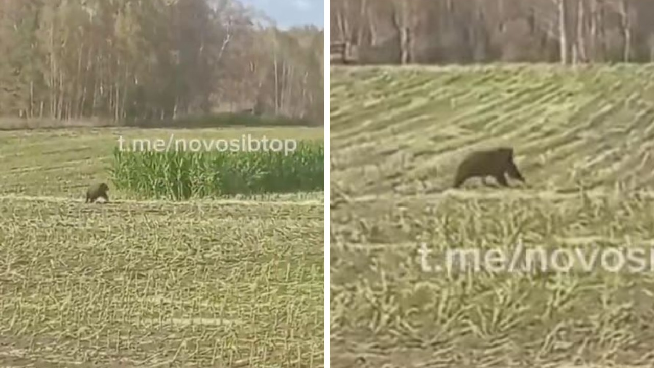 На кадрах заметно, как дикий зверь пробегает через всё поле с убранным урожаем. Люди пытаются запечатлеть медведя издалека. Вскоре животное скрылось в лесу.